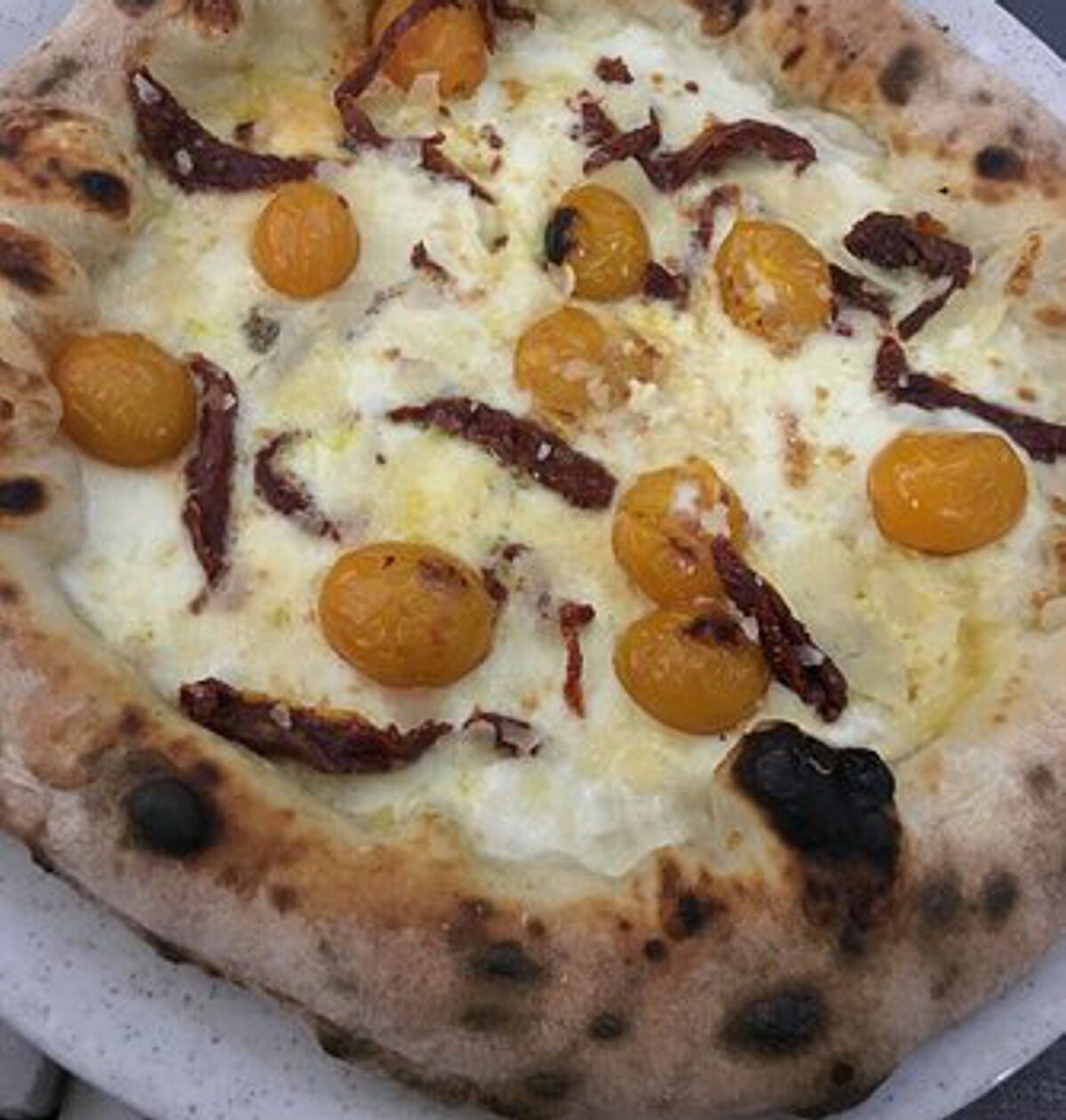 Mozzarella di bufala, pomodorini gialli, ciuffi di ricotta, acciughe, basilico. (Contiene allergeni)